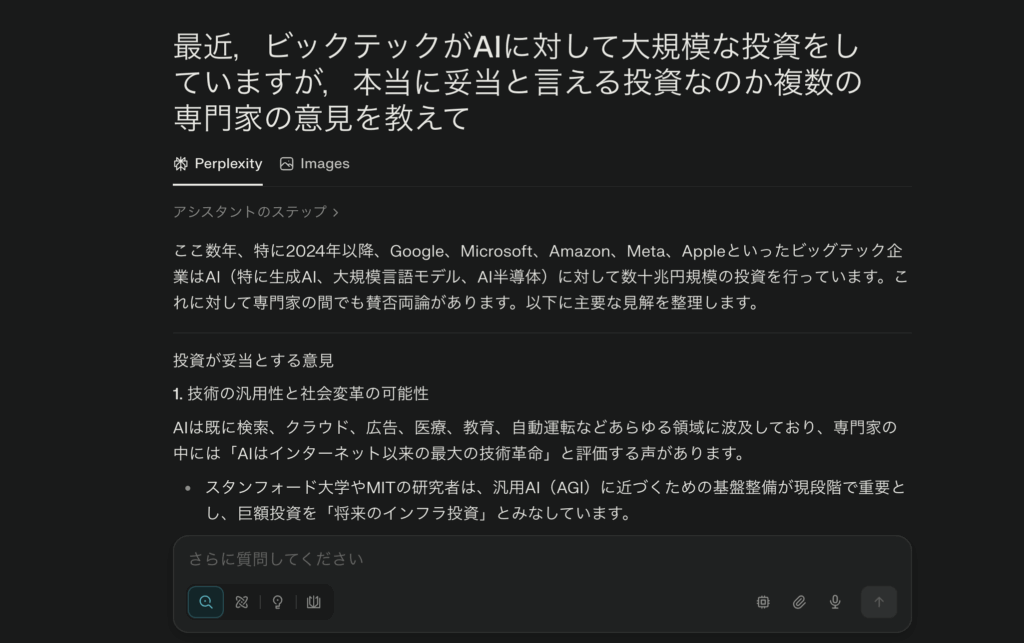 Perplexity ProはGPT-5,Gemini2.5 ProやGrok4などの最新高性能モデルにアクセスすることができ,質問内容に応じて最適なモデルで回答が可能です.また,「Pro Search」機能で検索の精度と速度が大幅向上。リアルタイム情報収集ができ、時事トピックもしっかりカバーします。