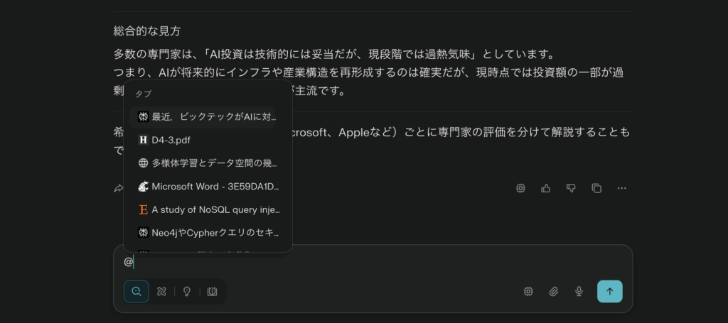 AIアシスタントへのプロンプト入力時に「@」を入力すると、現在開いているタブの一覧が表示されます。これを選択することで、AIはそれらの情報を参照し、質問に回答したり、比較表を生成したりします。